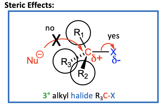 • Approach by the nucleophile to the electrophilic C of R3C-X is hindered