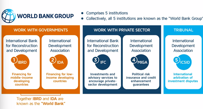 World Bank - comprises 5 institutions, all are known as the World Bank Group
