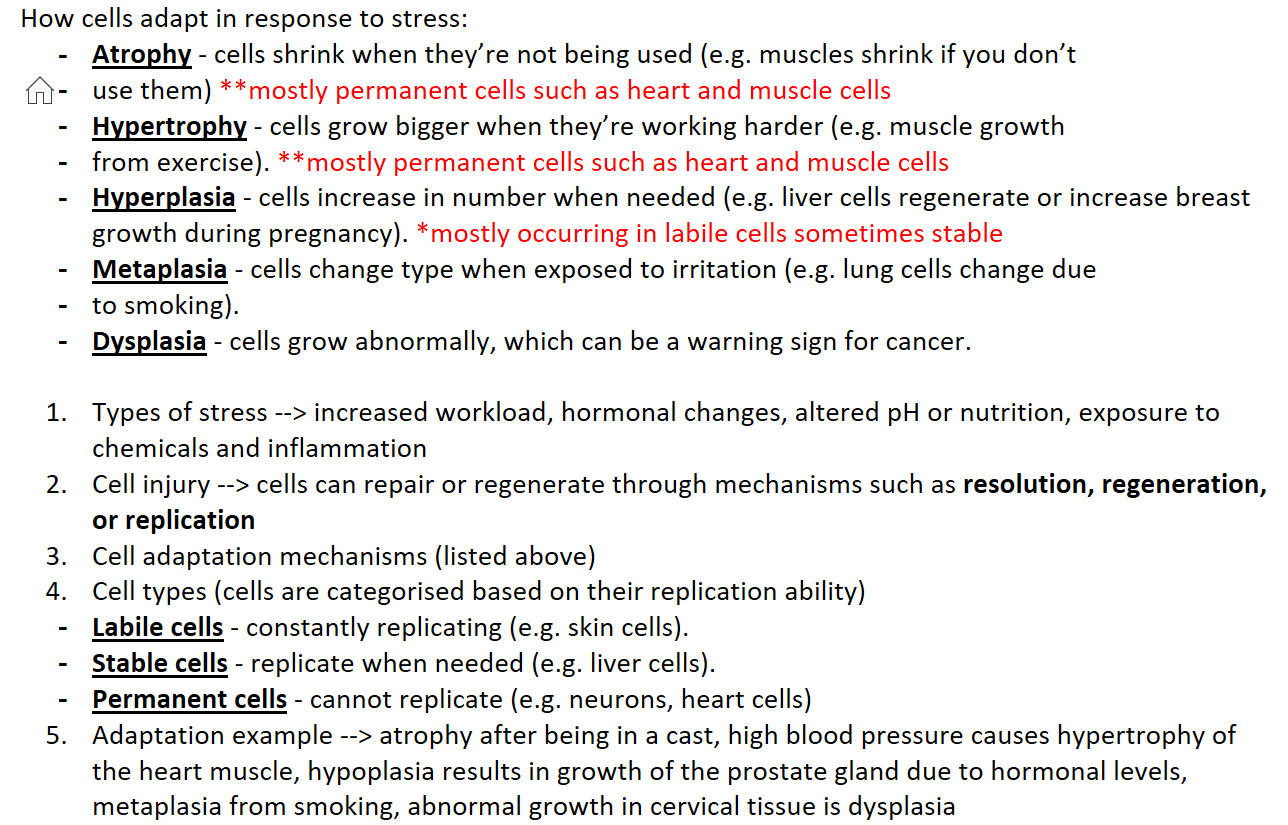 Adaptation example --> atrophy after being in a cast, high blood pressure causes hypertrophy of the heart muscle, hypoplasia results in growth of the prostate gland due to hormonal levels, metaplasia from smoking, abnormal growth in cervical tissue is dysplasia