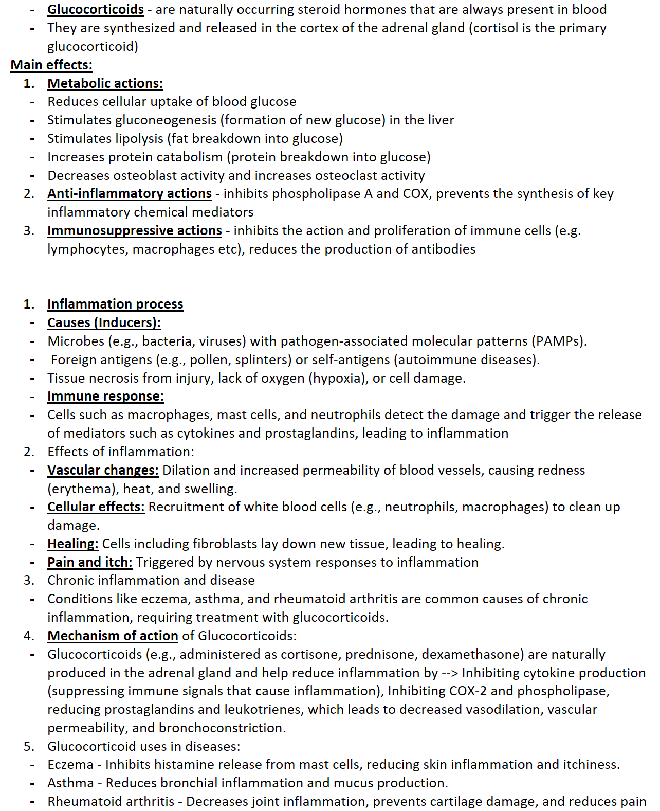 Glucocorticoids (e.g., administered as cortisone, prednisone, dexamethasone) are naturally produced in the adrenal gland and help reduce inflammation by --> Inhibiting cytokine production (suppressing immune signals that cause inflammation), Inhibiting COX-2 and phospholipase, reducing prostaglandins and leukotrienes, which leads to decreased vasodilation, vascular permeability, and bronchoconstriction.