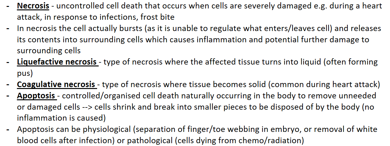 Necrosis - uncontrolled cell death that occurs when cells are severely damaged e.g. during a heart attack, in response to infections, frost bite