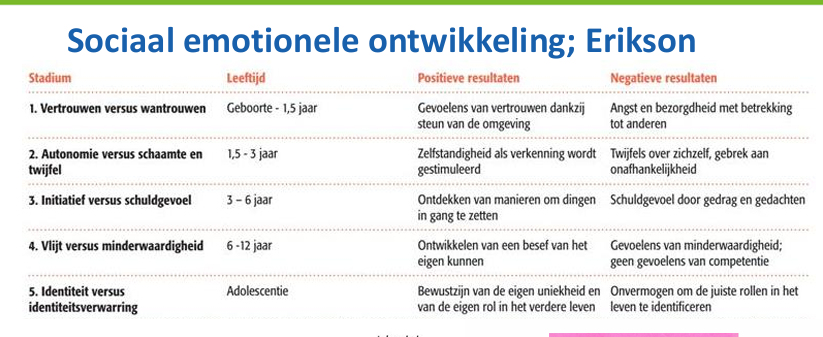 De student kan de ontwikkelingstaken van kinderen in verschillende leeftijdsfasen in hoofdlijnen beschrijven en kan de ontwikkelingsstadia van Erikson (sociaal-emotionele ontwikkeling) en Piaget (cognitieve ontwikkeling) benoemen en herkennen.