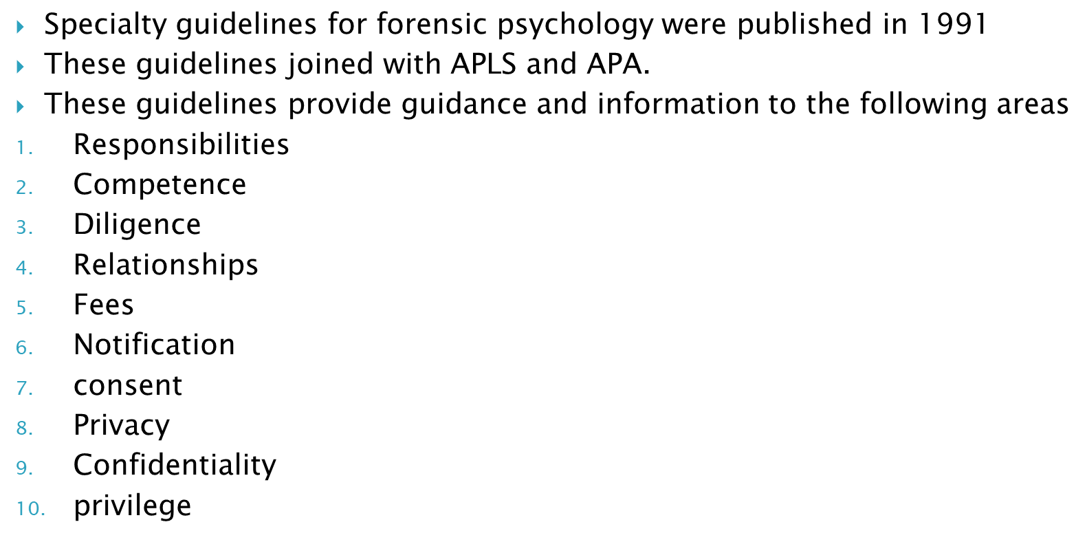 Guidelines for Forensic Psychology: Developed for ethical practices in forensic contexts, addressing responsibilities, competence, relationships, confidentiality, and research integrity.