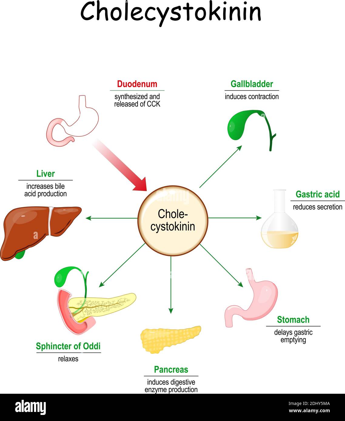 CCK (cholecystokinin) → ↓ gastric activity; ↑ pancreatic enzymes & bile release