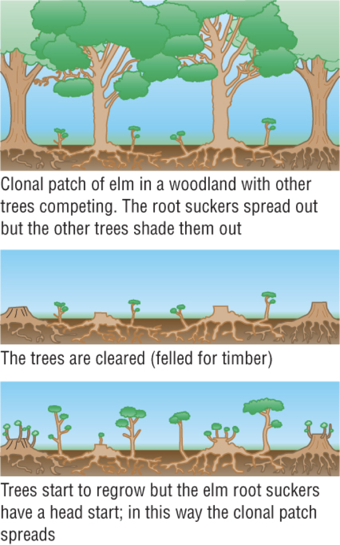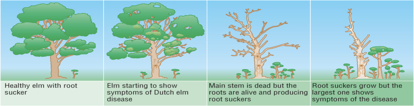 Vegetative propagation of elms by root suckers helps them survive damage and spreadĀ