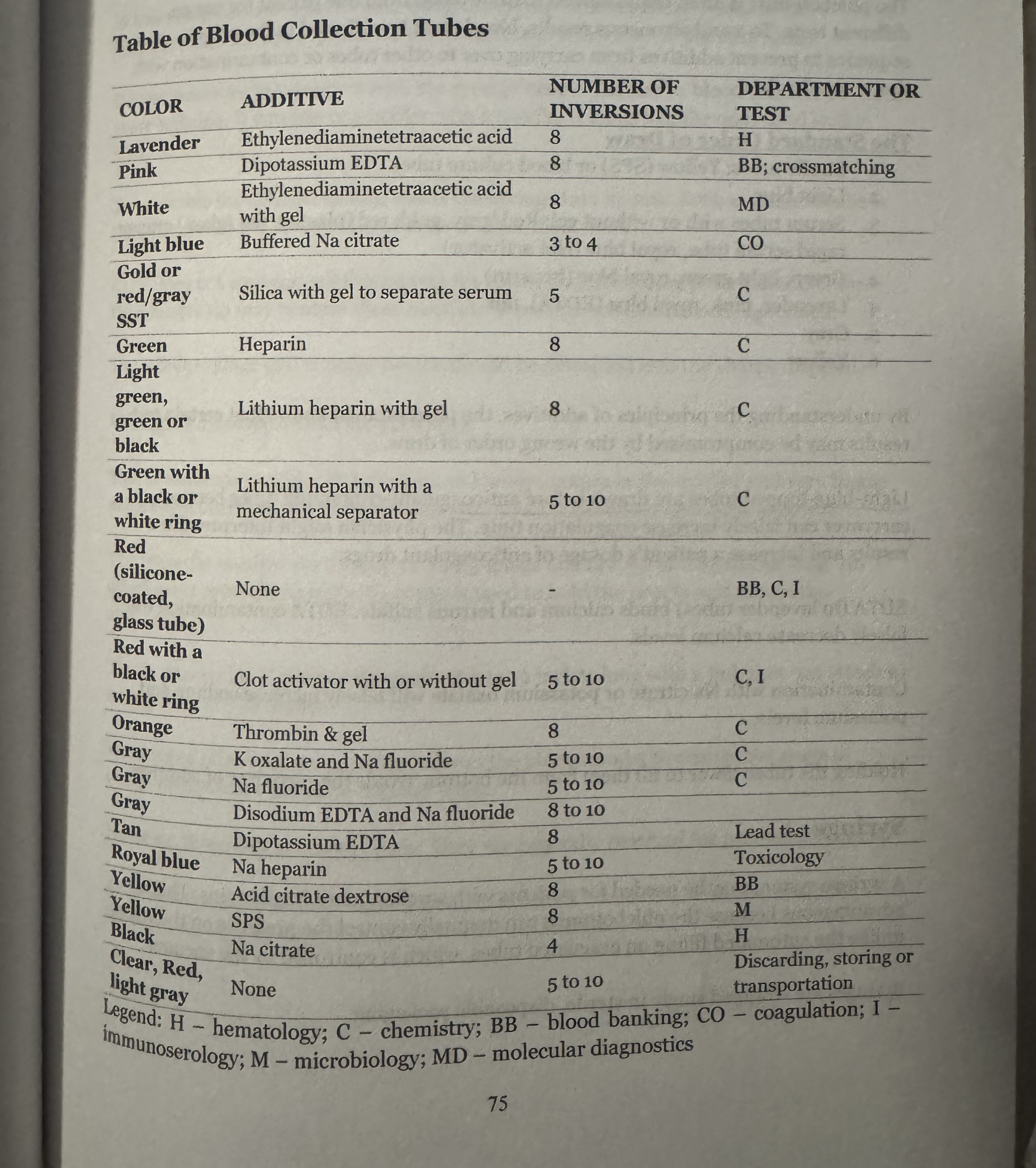 Blood Collection Tube Additives: A test may require either whole blood or only serum or plasma. Some test determinants may need certain chemicals to act as stabilizers, preservatives or anticoagulants. Tubes contain these chemicals, which are called additives. Anticoagulants may be required for tests using whole blood to prevent coagulation, which interferes with the reading of the results. These chemicals prevent the formation of a blood clot by binding calcium (ethylenediaminetetraacetic acid) or inhibiting thrombin (heparin). These tubes must be inverted an appropriate number of times to properly mix and prevent microclots. Do not shake. Shaking may cause hemolysis. The formation of air bubbles through the tube while inverting ensures adequate mixing. Some tubes use a powdered form of anticoagulants. When using these, tap the tube gently to loosen the particles and ensure proper mixing. Do not transfer blood from an additive-containing tube into another tube with other additives. This produces contamination and incorrect test results. A color-coding system helps identify which tubes to use for a test. This helps to easily identify which specimens should go in a particular tube. This is generally universal, although different manufacturers may utilize slightly different colors.