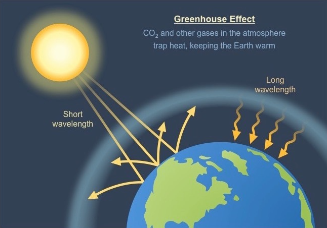Greenhouse gas effect - Short wavelength radiation enters the atmosphere, hits the surface of the earth and is absorbed, earth radiates the heat back out as long wavelength radiation, long wavelength radiation is absorbed and trapped by the greenhouse gases in the atmosphere