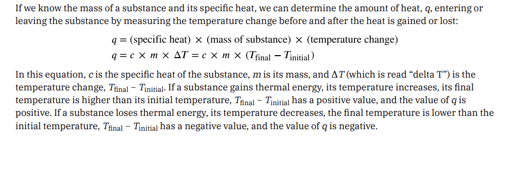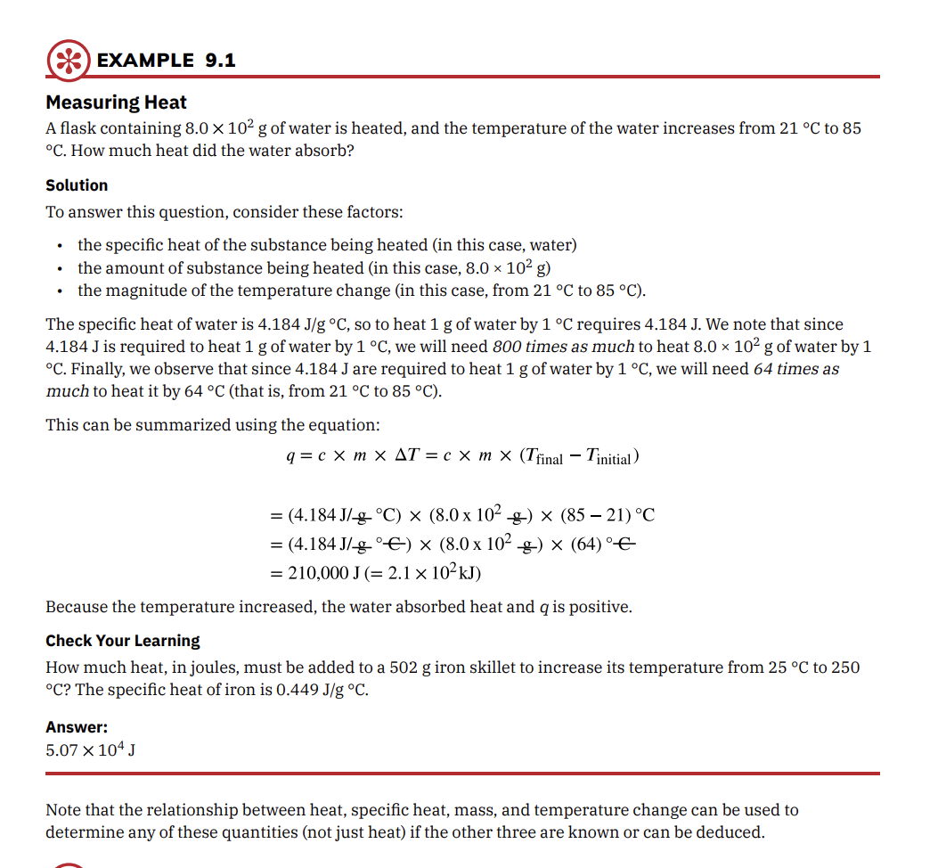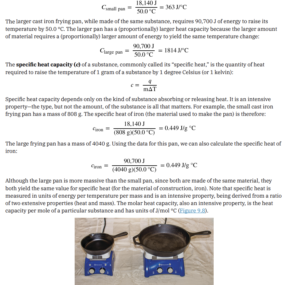 FIGURE 9.7 (a) An oxyacetylene torch produces heat by the combustion of acetylene in oxygen. The energy released by this exothermic reaction heats and then melts the metal being cut. The sparks are tiny bits of the molten metal flying away. (b) A cold pack uses an endothermic process to create the sensation of cold. (credit a: modification of work by “Skatebiker”/Wikimedia commons) Historically, energy was measured in units of calories (cal). A calorie is the amount of energy required to raise one gram of water by 1 degree C (1 kelvin). However, this quantity depends on the atmospheric pressure and the starting temperature of the water. The ease of measurement of energy changes in calories has meant that the calorie is still frequently used. The Calorie (with a capital C), or large calorie, commonly used in quantifying food energy content, is a kilocalorie. The SI unit of heat, work, and energy is the joule. A joule (J) is defined as the amount of energy used when a force of 1 newton moves an object 1 meter. It is named in honor of the English physicist James Prescott Joule. One joule is equivalent to 1 kg m2 /s 2 , which is also called 1 newton–meter. A kilojoule (kJ) is 1000 joules. To standardize its definition, 1 calorie has been set to equal 4.184 joules. We now introduce two concepts useful in describing heat flow and temperature change. The heat capacity (C) of a body of matter is the quantity of heat (q) it absorbs or releases when it experiences a temperature change (ΔT) of 1 degree Celsius (or equivalently, 1 kelvin): Heat capacity is determined by both the type and amount of substance that absorbs or releases heat. It is therefore an extensive property—its value is proportional to the amount of the substance. For example, consider the heat capacities of two cast iron frying pans. The heat capacity of the large pan is five times greater than that of the small pan because, although both are made of the same material, the mass of the large pan is five times greater than the mass of the small pan. More mass means more atoms are present in the larger pan, so it takes more energy to make all of those atoms vibrate faster. The heat capacity of the small cast 424 9 • Thermochemistry Access for free at openstax.org iron frying pan is found by observing that it takes 18,150 J of energy to raise the temperature of the pan by 50.0 °C: The l