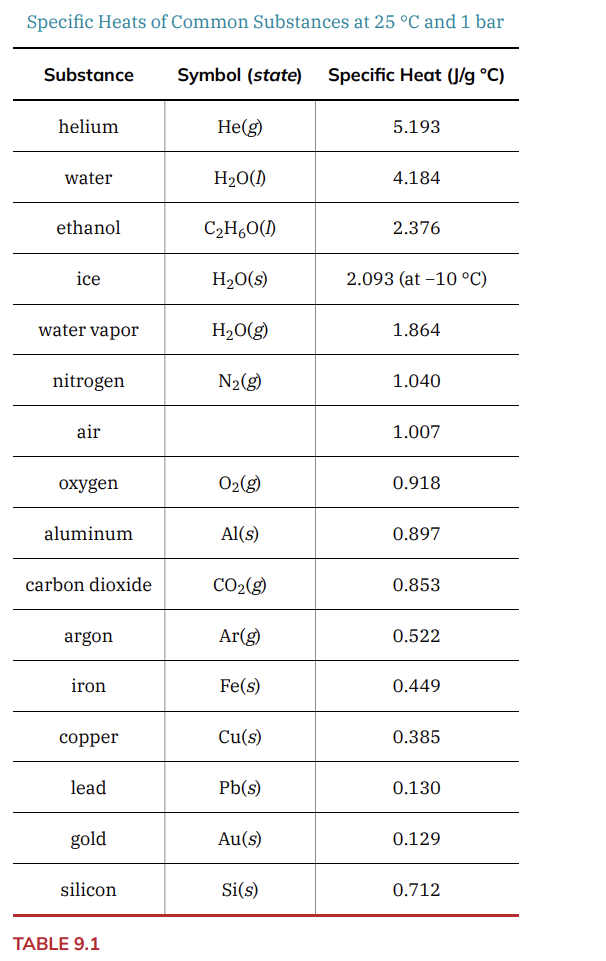 FIGURE 9.8 Because of its larger mass, a large frying pan has a larger heat capacity than a small frying pan. Because they are made of the same material, both frying pans have the same specific heat. (credit: Mark Blaser) Water has a relatively high specific heat (about 4.2 J/g °C for the liquid and 2.09 J/g °C for the solid); most metals have much lower specific heats (usually less than 1 J/g °C). The specific heat of a substance varies somewhat with temperature. However, this variation is usually small enough that we will treat specific heat as constant over the range of temperatures that will be considered in this chapter. Specific heats of some common substances are listed in Table 9.1.