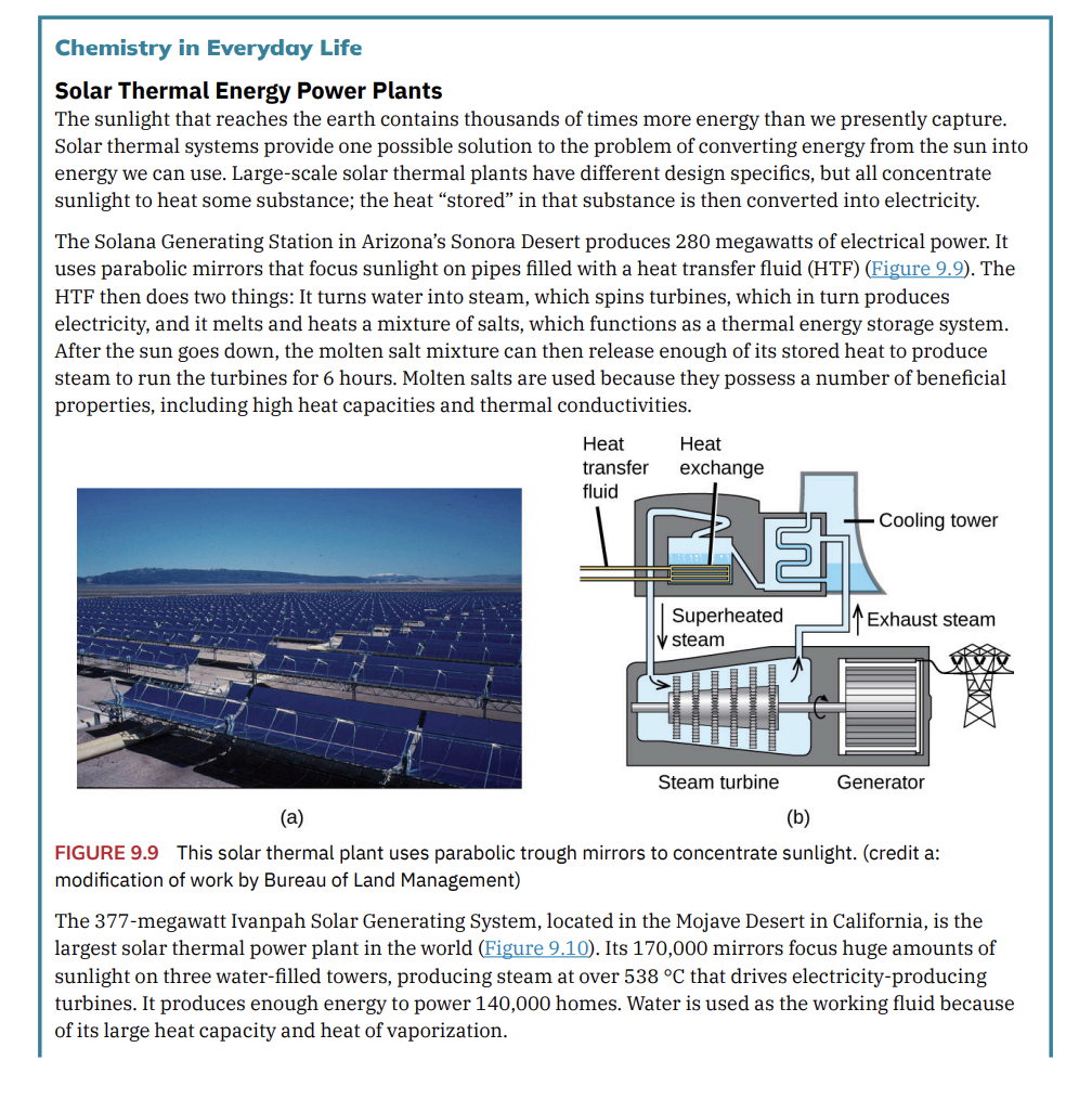 By the end of this section, you will be able to: • Define energy, distinguish types of energy, and describe the nature of energy changes that accompany chemical and physical changes • Distinguish the related properties of heat, thermal energy, and temperature • Define and distinguish specific heat and heat capacity, and describe the physical implications of both • Perform calculations involving heat, specific heat, and temperature change Chemical changes and their accompanying changes in energy are important parts of our everyday world (Figure 9.2). The macronutrients in food (proteins, fats, and carbohydrates) undergo metabolic reactions that provide the energy to keep our bodies functioning. We burn a variety of fuels (gasoline, natural gas, coal) to produce energy for transportation, heating, and the generation of electricity. Industrial chemical reactions use enormous amounts of energy to produce raw materials (such as iron and aluminum). Energy is then used to manufacture those raw materials into useful products, such as cars, skyscrapers, and bridges. FIGURE 9.2 The energy involved in chemical changes is important to our daily lives: (a) A cheeseburger for lunch provides the energy you need to get through the rest of the day; (b) the combustion of gasoline provides the energy that moves your car (and you) between home, work, and school; and (c) coke, a processed form of coal, provides the energy needed to convert iron ore into iron, which is essential for making many of the products we use daily. (credit a: modification of work by “Pink Sherbet Photography”/Flickr; credit b: modification of work by Jeffery Turner) Over 90% of the energy we use comes originally from the sun. Every day, the sun provides the earth with almost 10,000 times the amount of energy necessary to meet all of the world’s energy needs for that day. Our challenge is to find ways to convert and store incoming solar energy so that it can be used in reactions or chemical processes that are both convenient and nonpolluting. Plants and many bacteria capture solar energy through photosynthesis. We release the energy stored in plants when we burn wood or plant products such as ethanol. We also use this energy to fuel our bodies by eating food that comes directly from plants or from animals that got their energy by eating plants. Burning coal and petroleum also releases stored solar energy: These fuels are fossilized plant and animal matter.