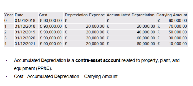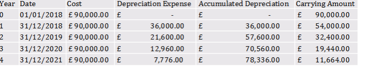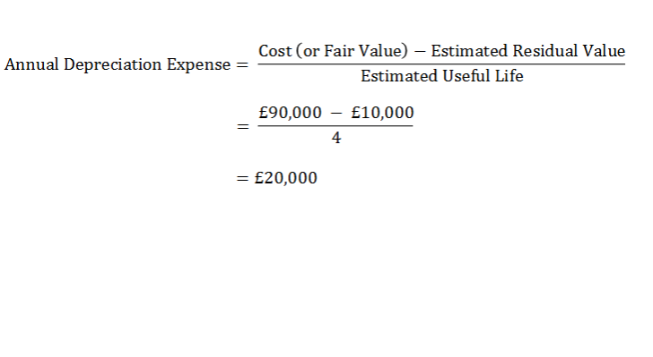 • Annual Depreciation Expense = (£100,000 – £20,000) / 4 = £20,000