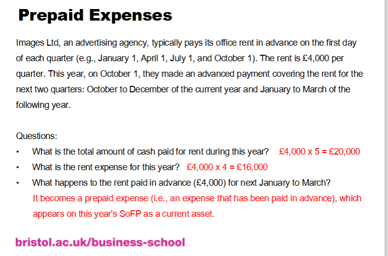o Examples: advance payments for expenses such as insurance premiums, rent,