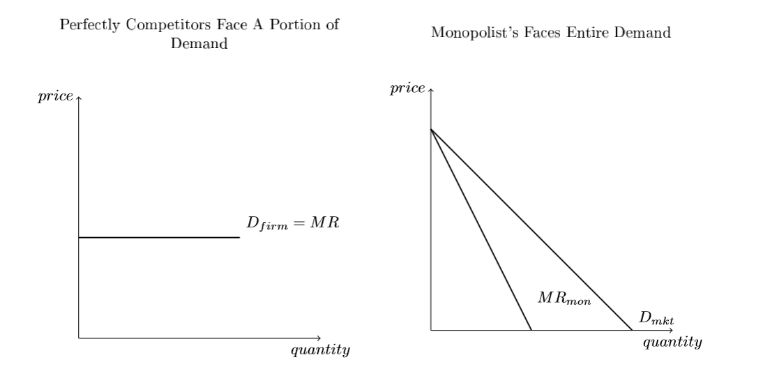 Monopolists face total demand curve and determine prices based on their market power:
