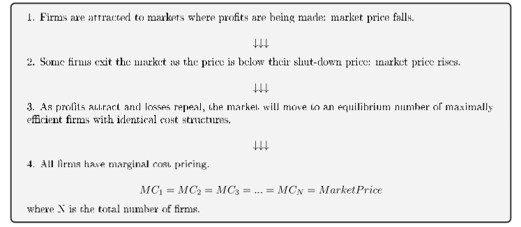 Firms are drawn to profitable markets, leading to market price decreases.