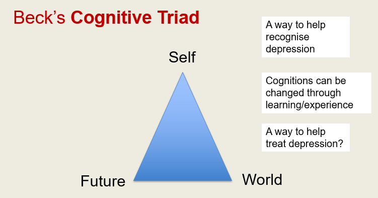 Beck’s Theory of Depression: Identifies negative triad of self, world, and future contributing to depression.
