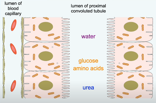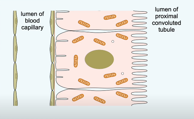 in the epithelial cells of the proximal convoluted tubule, Na+ ions are pumped out of the cytoplasm and into the bloodstream via active transport