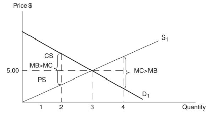 At a price of $5, three units of the good are purchased.