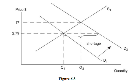 - As demand increases from D1 to D2 but supply stays constant, a shortage is created in the market