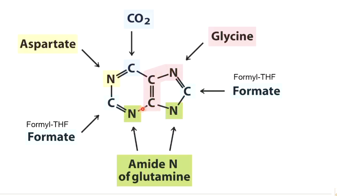 Aspartate, glycine, and glutamine contribute other parts of the purine base.