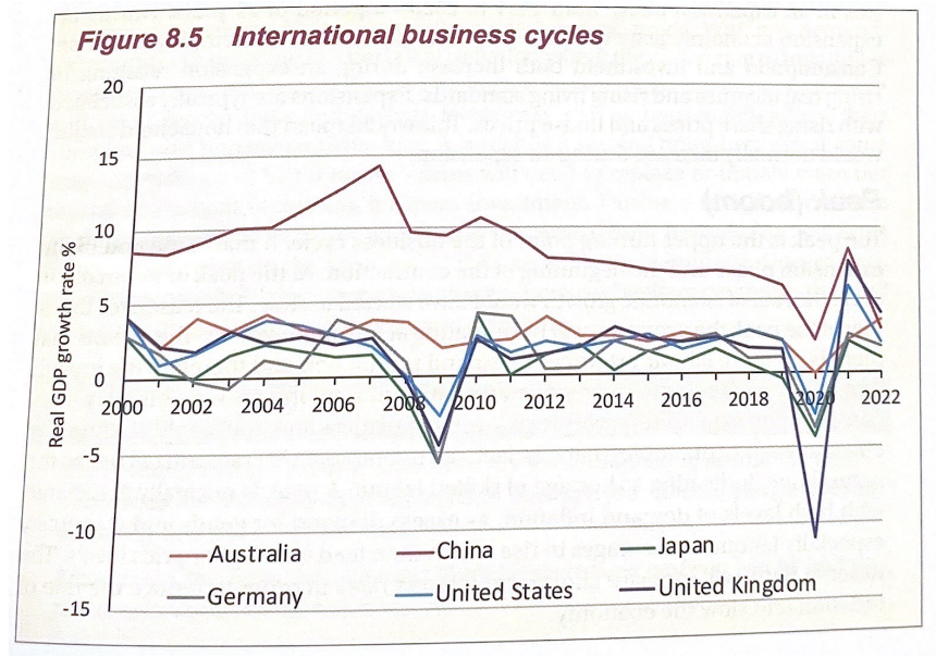 There is a close correlation between each country’s business cycle – the rises and galls in the growth rates are closely linked.