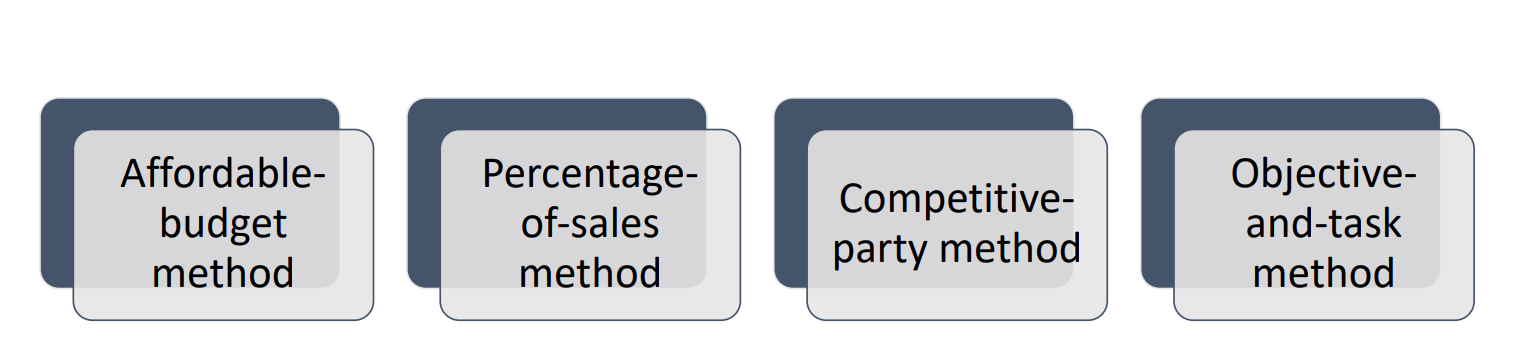 - Competitive-parity method * sets the promotion budget to match competitors’ outlays. • * Represents industry standards • * Avoids promotion wars