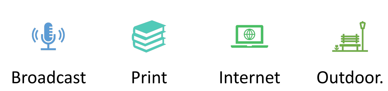 - Major media include print, broadcast, display, and online media.
