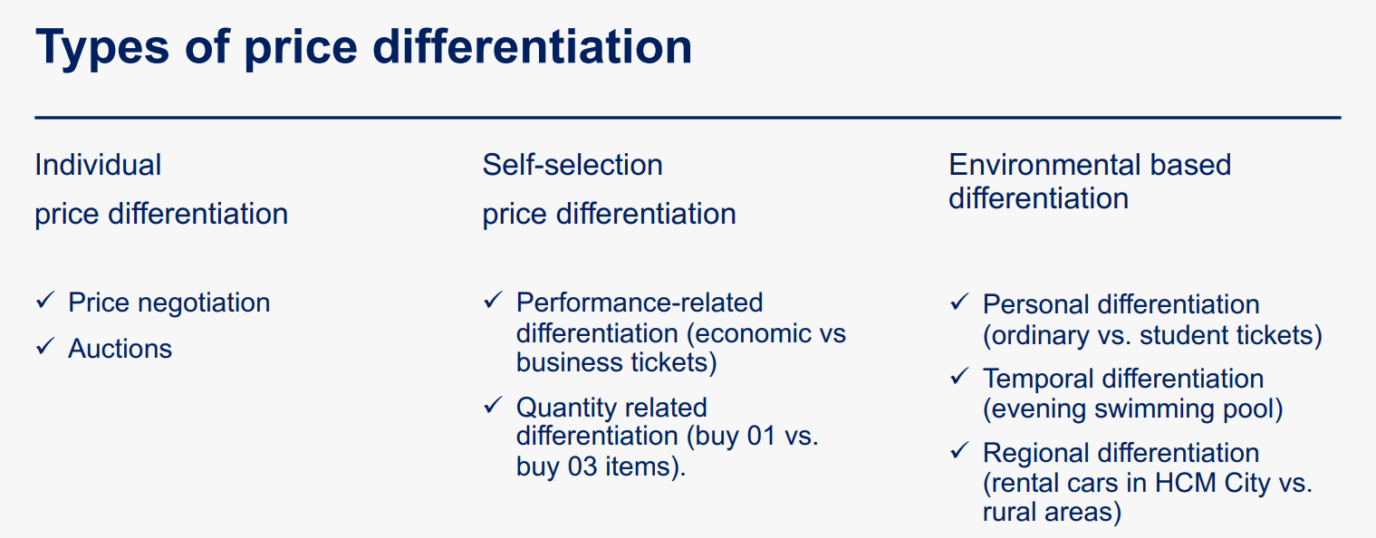- Price differentiation refers to setting prices that differ and vary for the same product/service depending on customer demographics