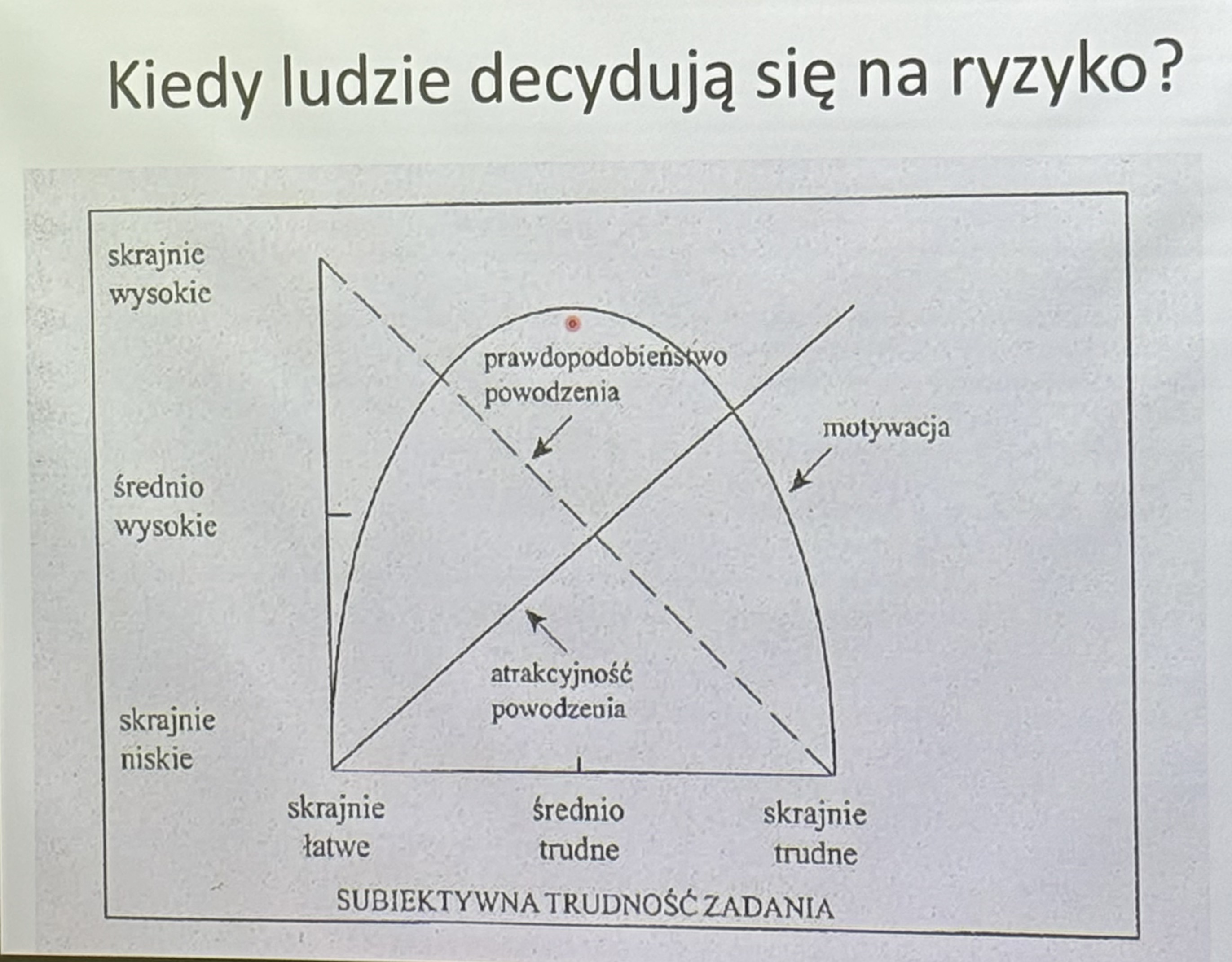 ALE gdy szansa prawdopodobieństwa bardzo niska, ryzyko też, motywacja spada (ofc nie zawsze, może być tak, że zadanie jest trudne ale “moje osobiste prawdopodobieństwo powodzenia” jest wyższe niż u innych wiec dam radę)