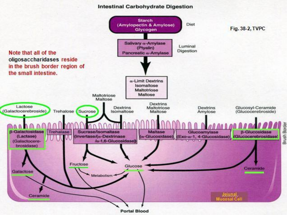 Saliva deactibated by acidity in the stomach. starch digestion is completed in the duodenum by pancreatic amylase. further digest of oligosaccharides done by duodenum and jejenum(highest capacity for absorbing sugars).