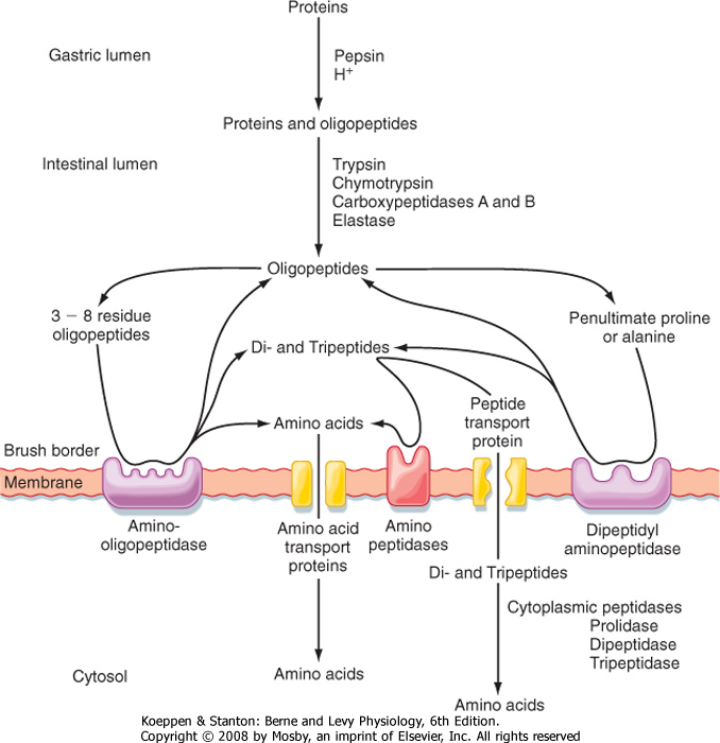Rate of transport of di and tripeps faster than single amino acids. Membrane responsible for this transport is PepT1 and it brings them in via an H+ conc gradient