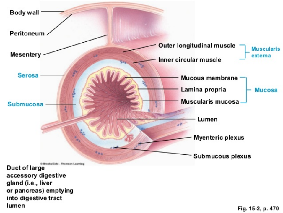 The mucosa is the innermost layer of the digestive tract and is highly folded, although the degree of folding varies regionally. It consists of 3 sublayers: the mucous membrane (epithelium), the lamina propria, and the muscularis mucosa. The mucous membrane is typically composed of columnar cells and is rich in mucus-secreting cells, serving as a protective surface with both exocrine and endocrine glands. The lamina propria is a connective tissue layer containing blood vessels, lymphoid tissue (GALT/MALT), and nerve fibers, which are important for defense against pathogens. The muscularis mucosa is a sparse layer of smooth muscle lying adjacent to the submucosa.