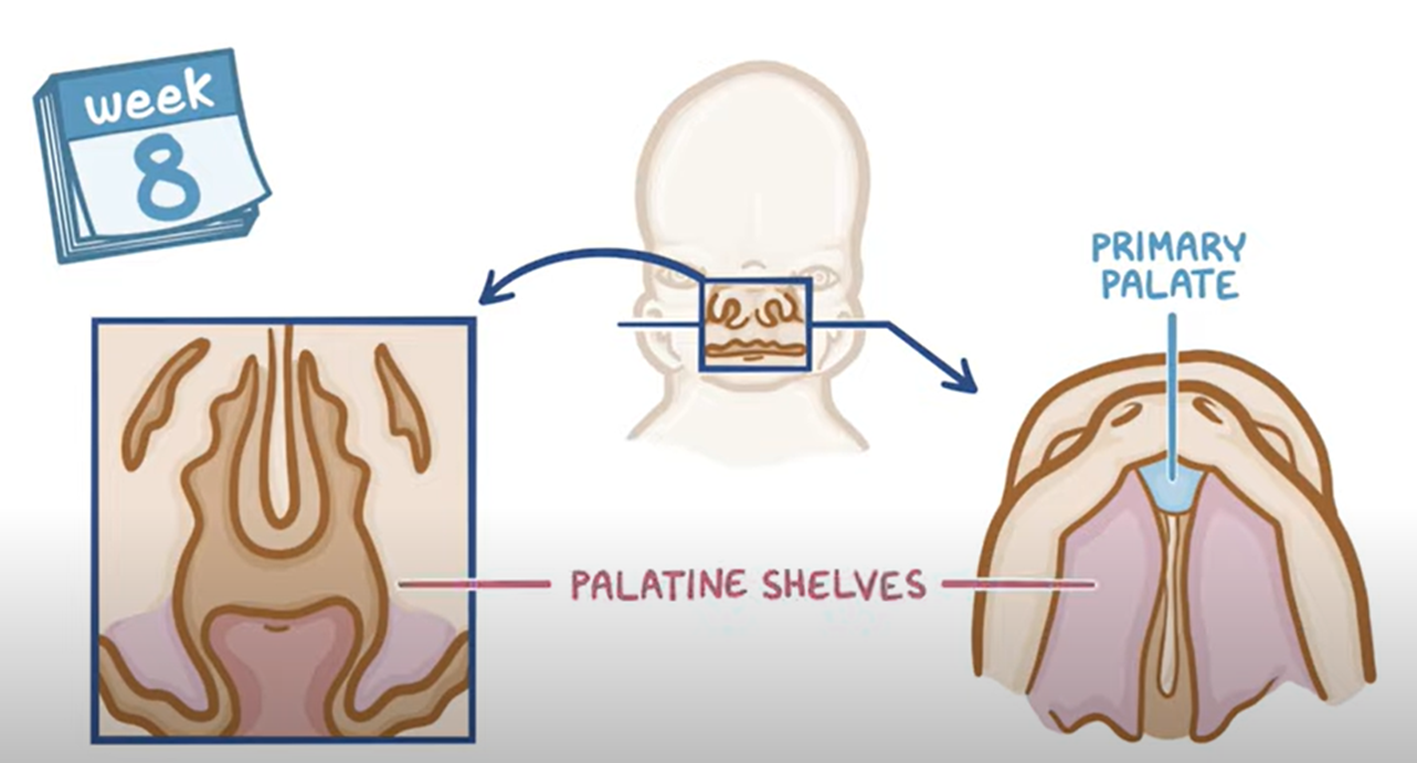 Weeks 8-9: Formation of primary palate and palatine shelves begins.