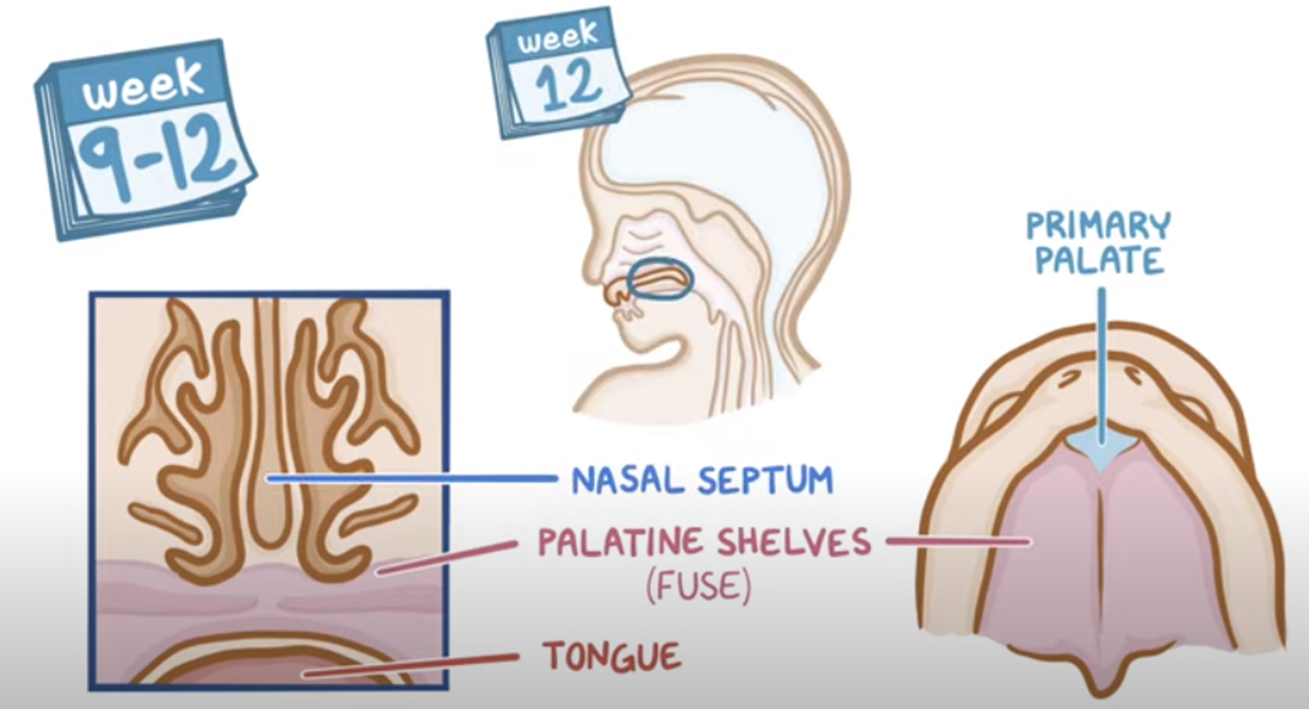 Weeks 9-12: Palatine shelves fuse with the nasal septum, establishing separation between oral and nasal cavities.