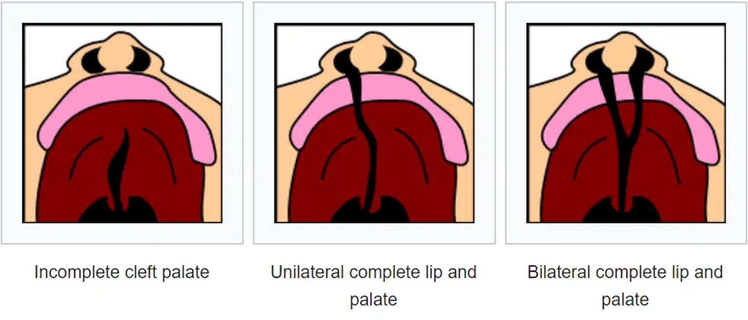 Types: Incomplete cleft palate (can get it at any point), unilateral complete lip/palate, bilateral complete lip/palate.