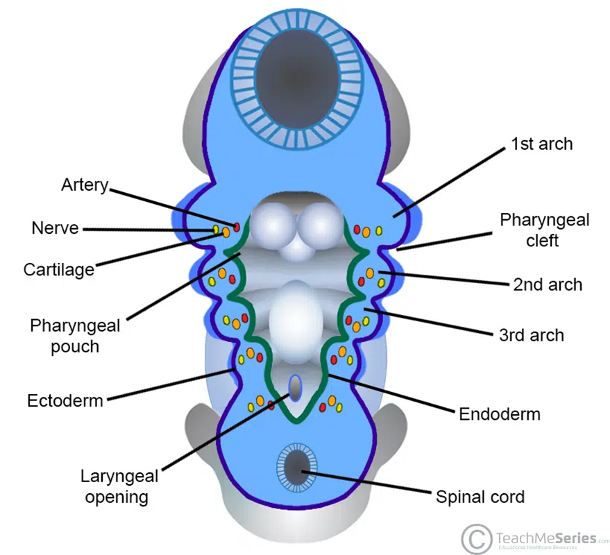 Pharyngeal Arches: Six arches arising in the 4th week, each associated with a branch of the aorta, a cranial nerve, and a cartilage bar.