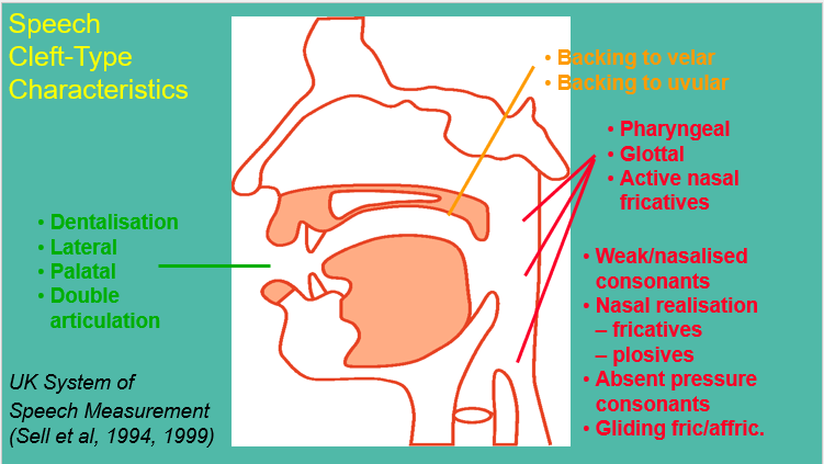 Speech errors (cleft): dentalisation (tongue between the teeth), palatilisation (/j/ sounds and laterlisation /ll/ and backed to velar/ uvular- /ch/.