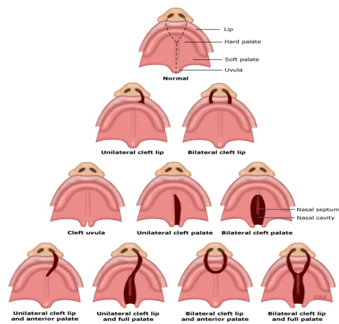 Including unilateral/bilateral cleft lip, cleft palate types (hard, soft, or both), and submucous cleft palate (bony parts and muscles have not formed).