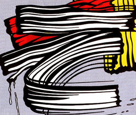 magnifies and abstracts a single brushstroke. Created with oil and synthetic polymer paint, it uses bold colors, thick black outlines, and Ben-Day dots, mimicking the look of printed media.