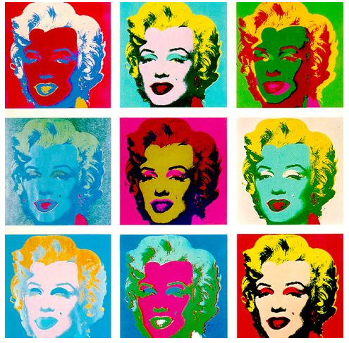 a series of nine silkscreen prints featuring repeated images of the actress Marilyn Monroe. Each print shows Monroe’s face in vibrant, varying colors, capturing both her iconic beauty and her media-saturated image.