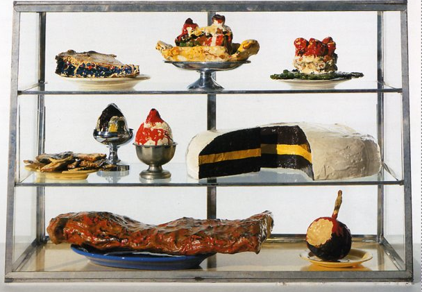 Pastry Case, 1961-62 enamel paint on nine plaster sculptures in glass showcase