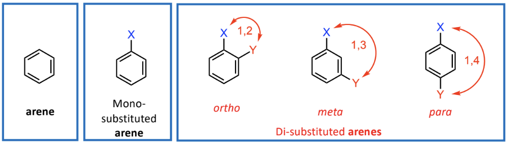 1,2 relationship (ortho), 1,3 relationship (meta), 1,4 relationship (para)