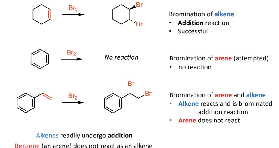 Alkenes readily undergo addition reactions while benzene (arenes) remains unchanged