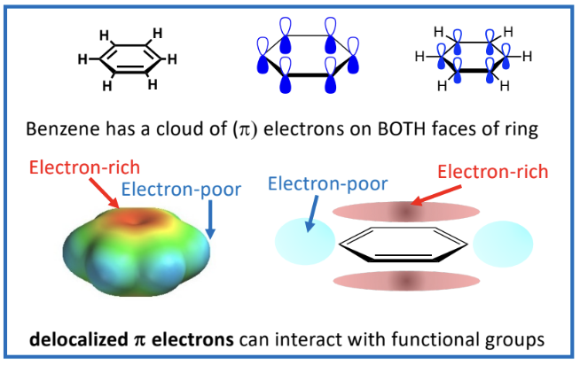 Benzene has delocalized p electrons which interact with functional groups