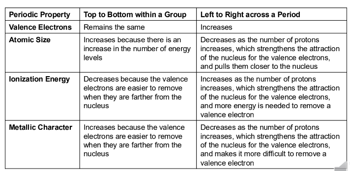 Valence electrons: remains the same down a group; increases left to right across a period.
