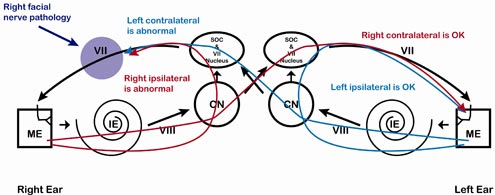 - Contralateral Pathway of AR—OE, ME, IE, CN VIII, Cochlear Nucleus, Superior Olivary Complex, to opposite ear Superior Olivary Complex, Facial Nerve, ME, OE (mark present or absent)
