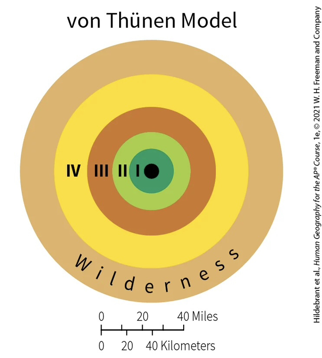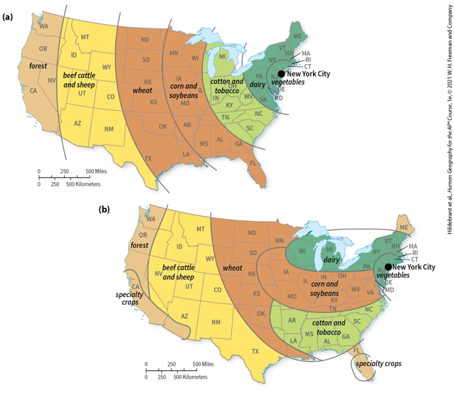 A) Applied to the USA: Assume that NYC is the only available market and there is no variation in climate or terrain. Placement of the zones has changed little from Von Thünen’s original model (forests are the outlier).