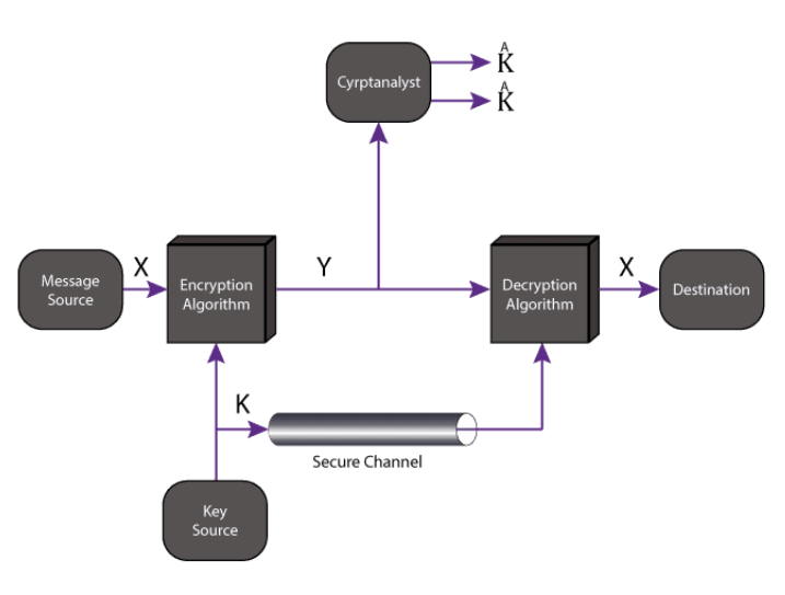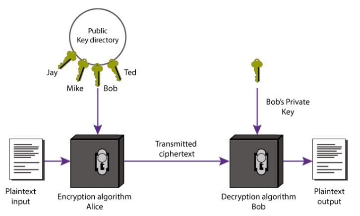 - An encryption algorithm that takes the receiver's public key (Kₚᵤb) and the sender's plaintext (M) and then returns a ciphertext (C): Enc(Kₚᵤb, M) -> C