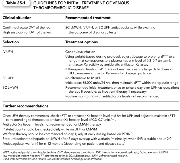 1. Indications. Patients with proven VTED may receive concomitant UFH for acute treatment and warfarin therapy acutely, followed by warfarin therapy for continued prevention of recurrence of VTED (Table 35.1), unless contraindications to warfarin (e.g., pregnancy) are present.