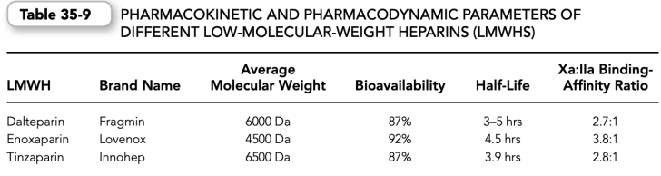 (c) Therefore, compared with heparin, which has an anti-factor Xa to antifactor IIa binding affinity ratio of approximately 1:1, the various commercial LMWHs have an antifactor Xa to antifactor IIa binding affinity ratio varying from 2:1 up to 4:1, depending on their molecular size distribution (Table 35-9).