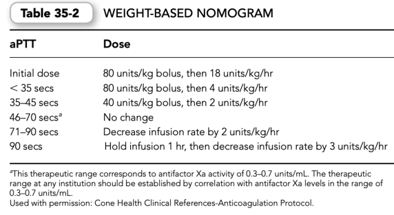 (4)Initial heparin weight-based dosing nomograms and subsequent adjustment proto- cols have been developed to assist the initial weight-based dosing efforts. Such protocols should be developed for a specific aPTT reagent (Tables 35-2 and 35-3).